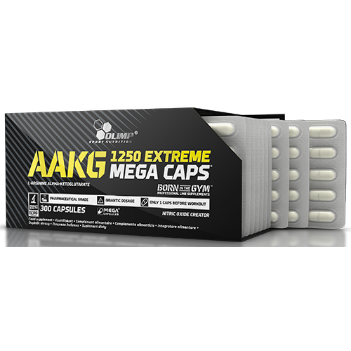 AAKG 1250 Extreme Mega Caps Olimp – Аргинин альфа-кетоглютарат (ААКГ) в капсулах – аминокислота, источник аргинина. Используется для увеличения скорости набора сухой мышечной массы, повышения силы и выносливости мускул. Благоприятно, но косвенно (за счет повышения интенсивности и продолжительности тренировок) сказывается на сжигании жира, в том числе подкожного. Таким образом, позволяет не только нарастить мышцы, но еще и избавиться от покрывающей его прослойки подкожного жира.